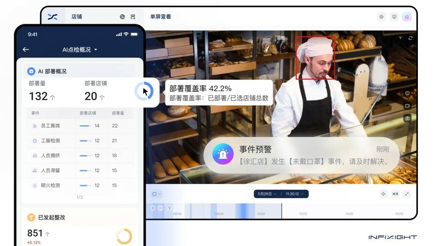 AI 抓取违规事件,如监控识别出某员工未穿工服;