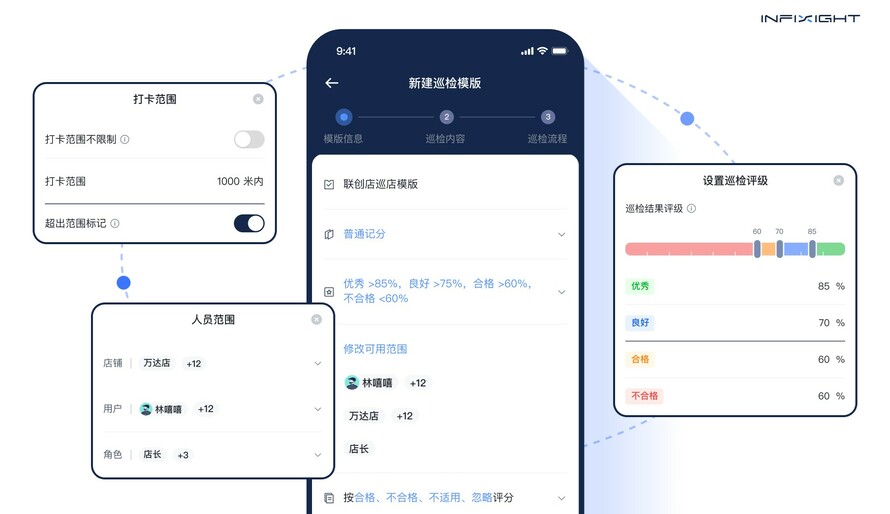 系统内嵌 AI 能力,可自动生成适配品牌业态的巡店日程、巡检路线与检查表模板。