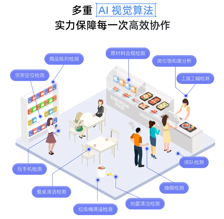 商超零售 :智能管人理货,减损耗、提效益。监测客流与热区科学调配人力,优化货架陈列布局提升营业转化,守护贵重库存确保财产安全。