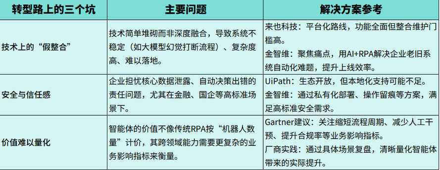 综合来看,在转型智能体这件事上,各家厂商的选择不尽相同。平台派代表如来也科技强调功能齐全,但落地门槛稍高; UiPath这种国际派主打生态开放,但在中国市场的适配和安全合规上有所掣肘;金智维则更务实,从金融、运营商等复杂场景切入,把AI和RPA融合在“能真正解决问题”的流程里,形成了“认知+执行”的双引擎。路径虽然不同,但有一点是共识:智能体不是换个名字,而是真正要帮企业解决那些传统自动化搞不定的难题。