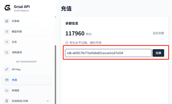 访问GrsAi(grsai.com/zh/dashboard/admin/cdkey),