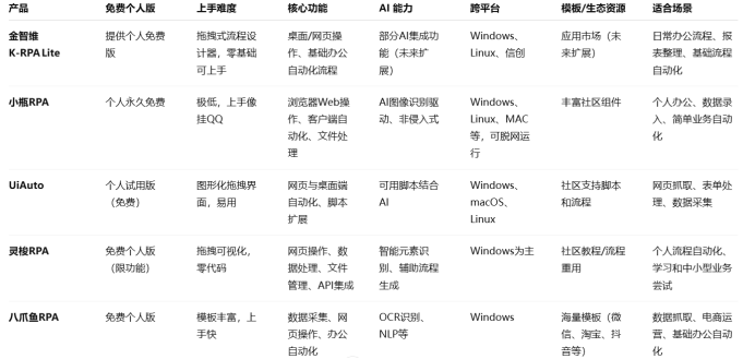 总的来说,现在市面上有不少个人免费使用的RPA工具,各有特点和侧重点。其实免费的RPA工具已经够个人和小团队使用了,各个产品的能力总结都放在下表了,大家可以自行对比,它们各有侧重点,都是帮你省时间、减重复工作的好帮手。最重要的就是先上手,挑一款适合自己的工具,学起来、用起来,动手搭建几个自动化流程,你就会发现日常工作真的能轻松不少!