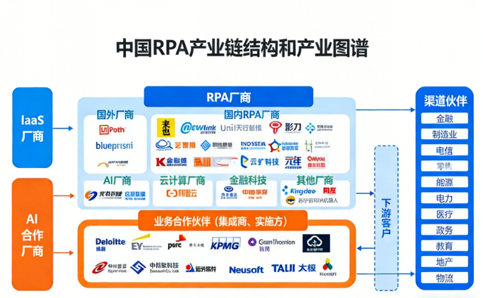 RPA产业链主要参与者有四大类:RPA厂商、技术合作伙伴、业务合作伙伴、渠道合作伙伴。