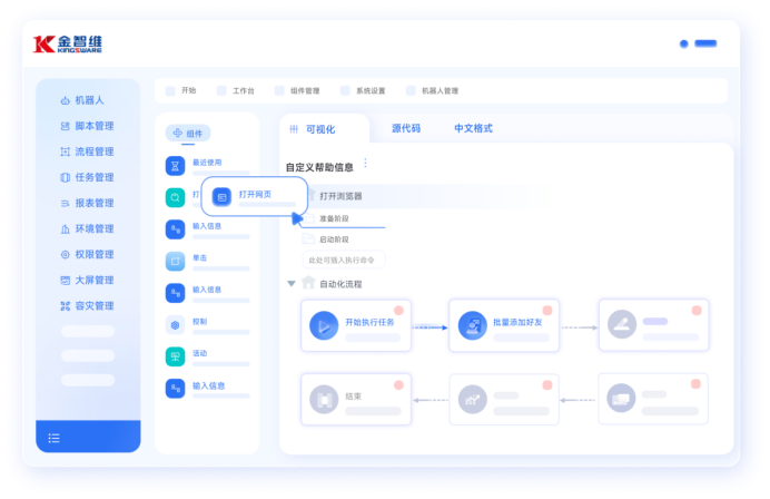 因此 易用性并不是唯一 , 还需要 看平台是否具备成熟的组件库、系统连接能力以及流程管理能力。一些 国内的 企业级RPA 平台 ,例如 金智维,在设计上既强调低代码易用性,也保留了较完整的开发能力,这样在流程规模扩大时更容易持续扩展 ,同时它的稳定性也较高,可以支撑企业级多并发流程 。