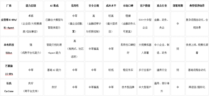 在国内市场,RPA 厂商数量不少,企业在选型时可以重点关注以下几个方面。