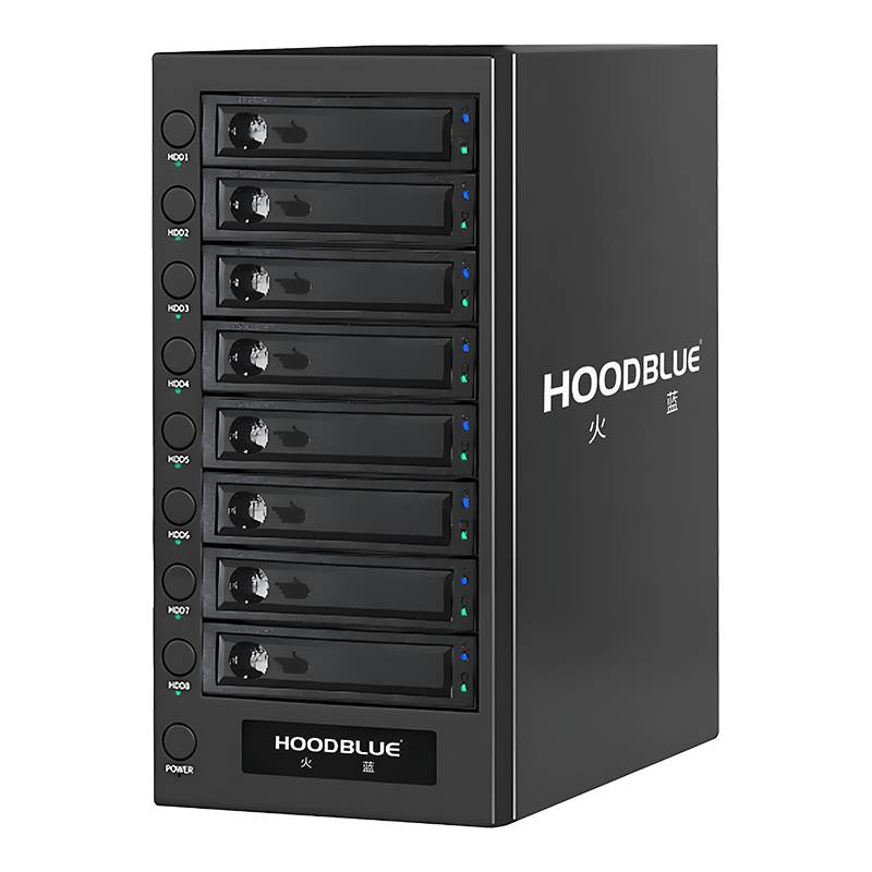 火蓝(Hoodblue) DS80 32 配备USB 3.2 Gen 2 ( 10Gbps ) 接口,足以跑满多块机械硬盘 RAID 阵列或 SSD 缓存阵列的极限速度。通过可选配的阵列管理软件,火蓝 (Hoodblue) DS80 32 能实现更复杂的存储策略。适合中型设计公司、影视后期团队、科研实验室作为本地高速共享存储或近线备份库,以合理的成本管理高达数百TB (使用 30TB 硬盘)的数据海洋。