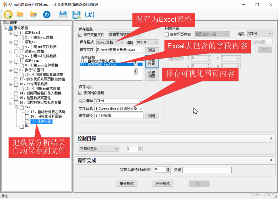 如果需要更好的分析数据变化轨迹,预测数据变化趋势,往往需要保存历史数据分析报告。在浏览器项目管理窗口新建保存内容步骤,生命名为“保存分析结果文件“。可以选择两种数据保存方式,一是把数据分析结果保存为Excel表格,添加需要保存的字段和内容;二是直接保存可视化图表页面。浏览器支持以日期命名保存文件,在文件名中输入浏览器变量”{_CurrentDate}”,保存文件时自动替换为当前日期。
