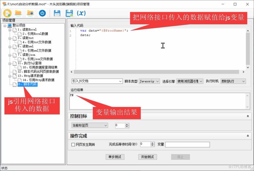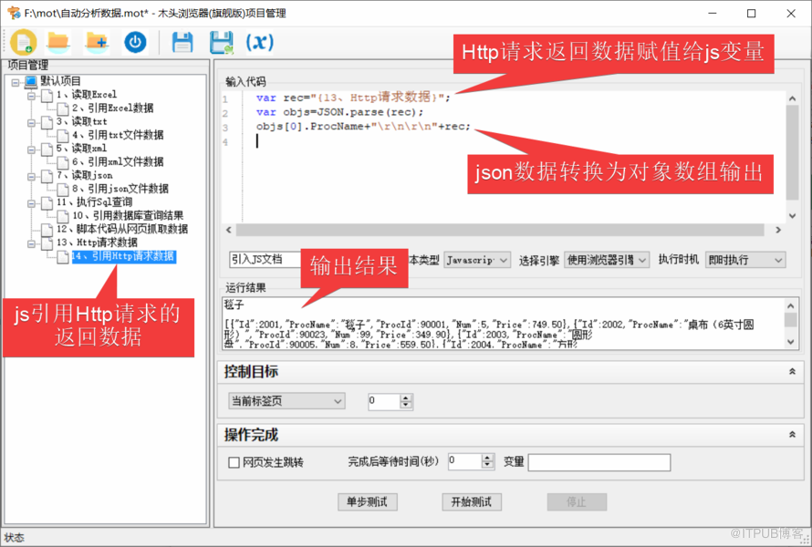 服务器返回数据后,保存为浏览器变量。在项目管理器中新建脚本控制步骤,并重命名为“引用Http请求数据”。定义一个JavaScript变量,并把服务器返回数据赋值给它。一般服务器返回数据采用json格式,只需要使用JSON.parse()函数就转换为对象数组,分析输出对象数据更方便。