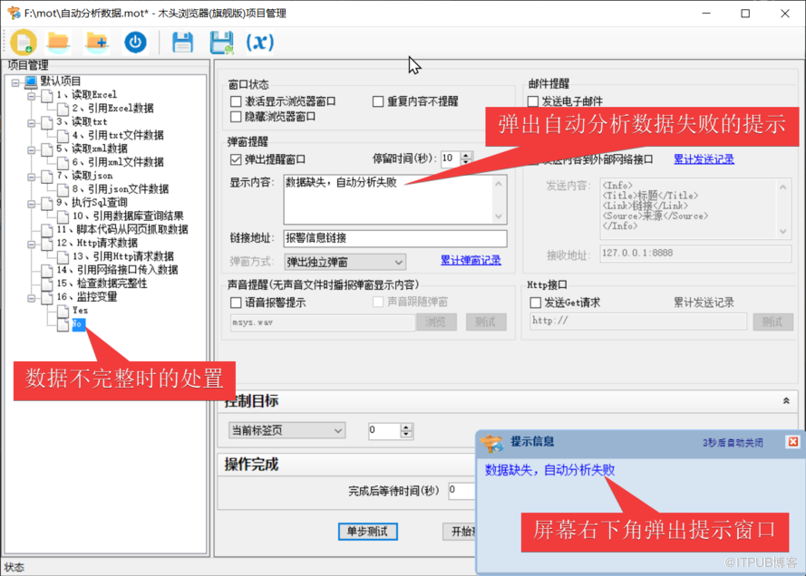 当未获得完整数据,不具备数据分析条件时,执行No分支节点,勾选弹出提醒窗口,弹窗显示内容为“数据缺失,自动分析失败”,弹窗停留10秒后自动关闭。