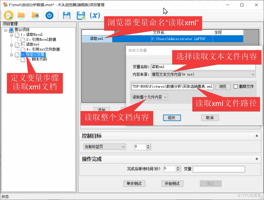 在项目管理器窗口,新建自定义变量步骤,添加变量时,设置变量名称为“读取xml”,选择内容来源为文本文件,并设置文件完整路径,选择“读取整个文件内容”。如下图所示,当项目执行本步骤时,读取“实体店销售表.xml”文件内容,然后保存到名为“读取xml”的浏览器变量。
