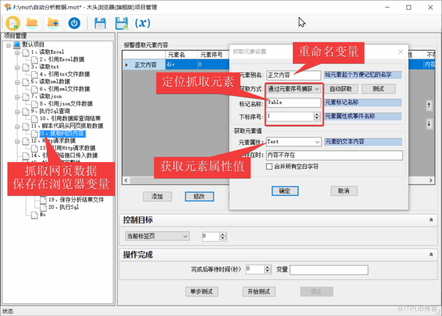 第一种方法,在浏览器项目管理窗口,新建“抓取内容”步骤,添加抓取元素,重命名元素别名为“正文内容”,即可以定位整个数据表元素,也可以只抓取一个单元格,设定抓取元素的Text文本内容。抓取后内容存放在浏览器变量。
