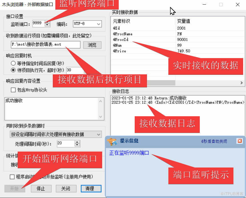 在浏览器外部数据接口设置窗口中,首先设置本地监控网络端口号,当接收到数据时需要触发执行的项目,点击开始按钮,弹窗提示正在监听的数据窗口。