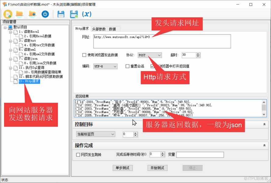 在浏览器项目管理窗口中,新建“Http请求”步骤,输入请求网址,选择请求方式为Post或Get,根据服务器要求可能还需要设置Http协议头数据,发送请求等待返回结果。