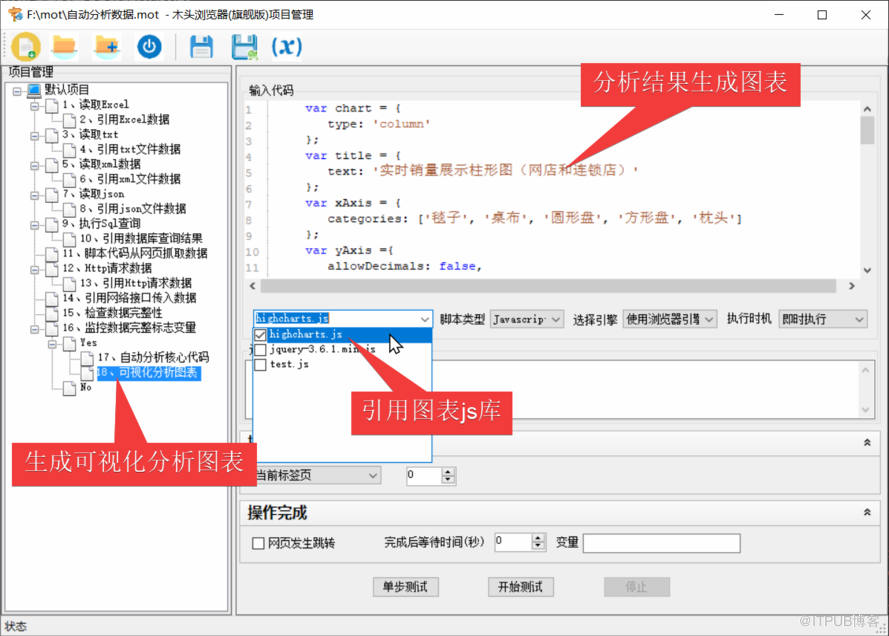 在浏览器项目管理窗口新建脚本代码步骤,重命名为“可视化分析图表”,引用highcharts.js图表库,JavaScript只需设定图表的各项参数,就可以生成带图表的Html源码。