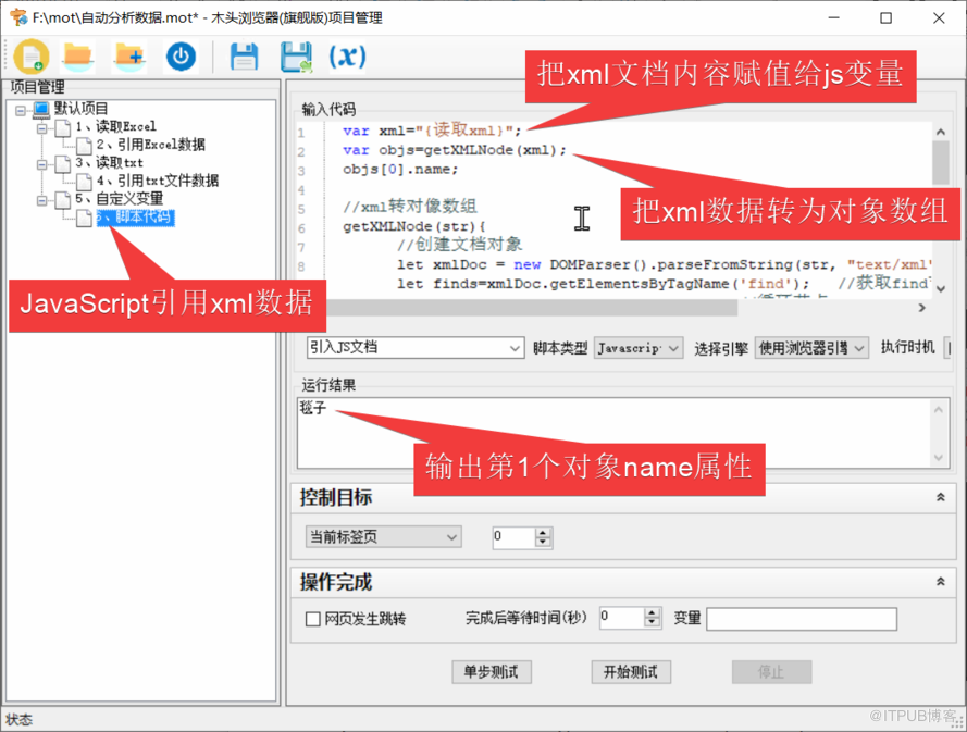 当浏览器执行该步骤前,先计算浏览器变量的值 ,再用其值替换对应的浏览器变量名。生成新的JavaScript代码再执行。获取整个xml文档数据后,用getXMLNode(自定义函数)把xml格式的字符串转换为JavaScript数据对象,再调用对象的属性值就很方便了。