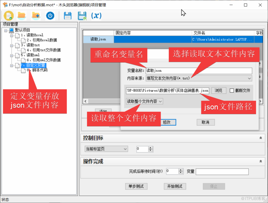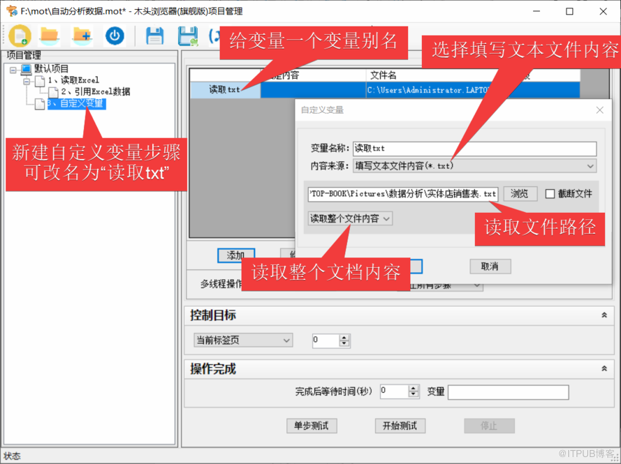 在项目管理器中创建一个自定义变量步骤,添加变量时,设置变量名称为“读取txt”,选择内容来源为文本文件,并设置文件完整路径,选择“读取整个文件内容”。如下图所示,当项目执行本步骤时,读取“实体店销售表.txt”文件内容,然后保存到名为“读取txt”的浏览器变量。