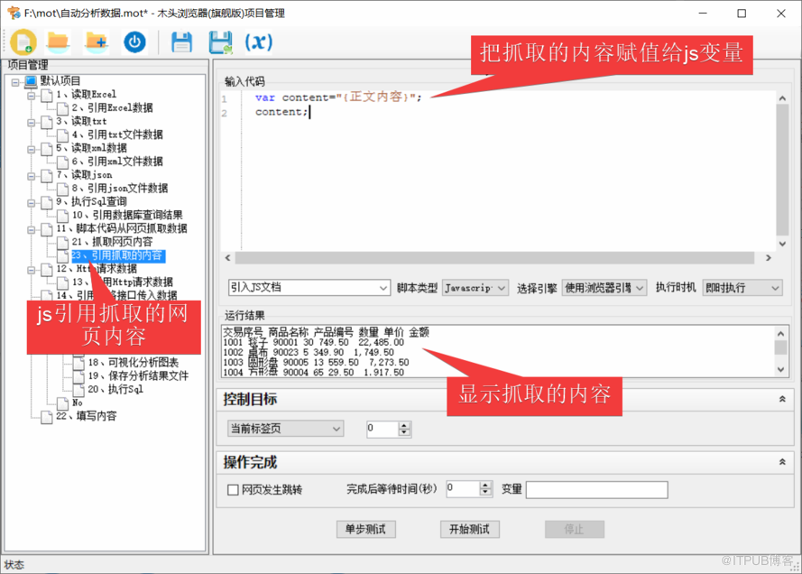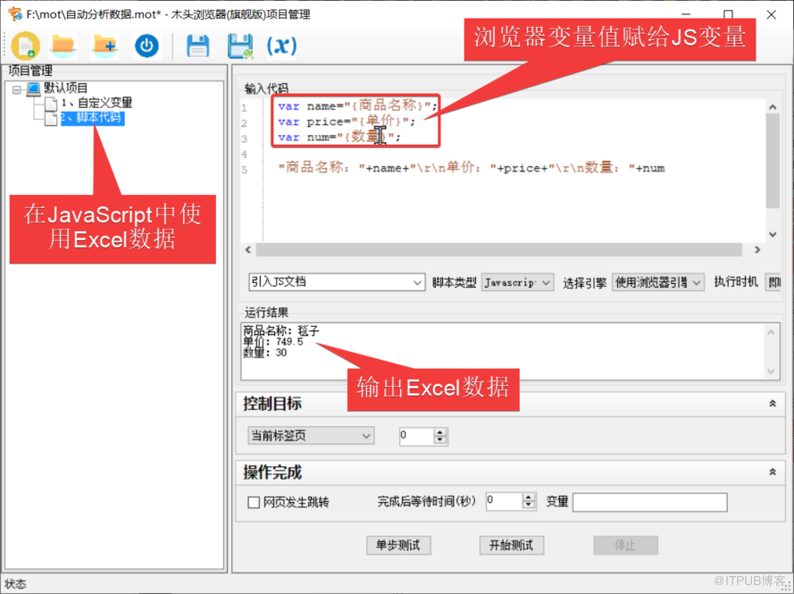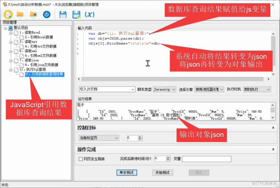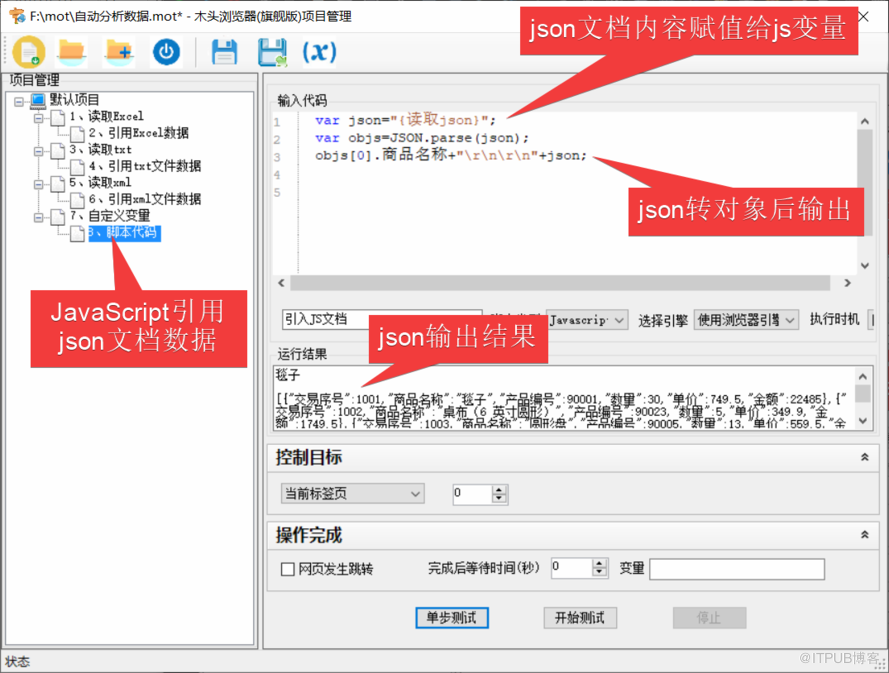 当浏览器执行该步骤前,先计算浏览器变量的值 ,再用其值替换对应的浏览器变量名。生成新的JavaScript代码再执行。获取整个json数据后,用“JSON.parse(db)”把json格式的数据转换为JavaScript数据对象,使用时可直接调用对象的属性值。