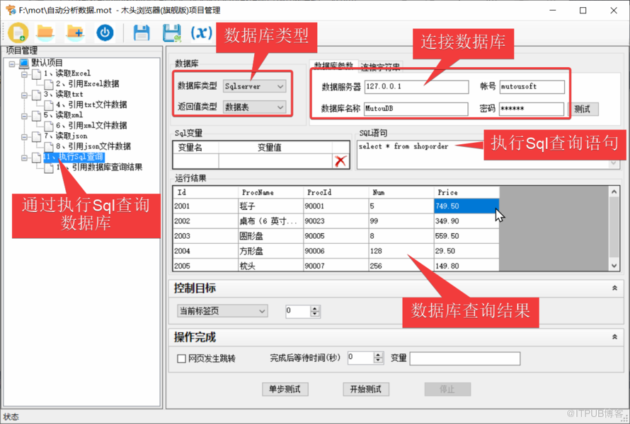 在浏览器项目管理窗口,新建“执行Sql”步骤,并重命名为“执行Sql查询”。选择需要连接的数据库类型,浏览器支持主流关系数据库Sqlserver、Mysql、Access、Sqlite和Oracle,设置查询结果返回值为“数据表”。设置数据库连接参数和用户名密码,可以连接远程数据库 。最后输入查询数据的Sql语句执行,在运行结果框里显示返回的数据表。
