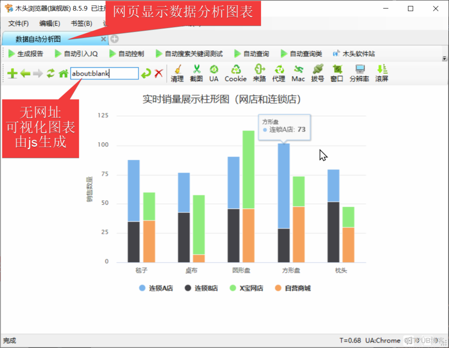 为了低成本快速实现数据分析,就需要把数据收集、计算分析、展示分析结果的过程自动化。使用 框架,生成自动化分析数据方案,有效降低软件成本。这里我们使用木头浏览器为例说明具体方法,因为浏览器支持JavaScript脚本代码,因此具体数据分析算法使用JavaScript来完成。数据分析结果通过生成HTML网页来展现。