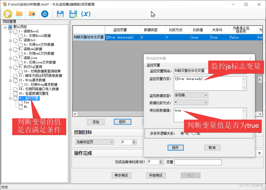 通过判断数据完整性标志变量,才能选择下一步操作。在浏览器项目管理窗口创建“监控变量”步骤,该步骤自动生成Yes和No两个分支节点。添加监控变量,重命名为“判断完整性标志变量”,这里需要监控JavaScript的dataready变量,浏览器调用JavaScript变量的格式为“{JSvar:dataready}”,判断该变量的值为true时,下一步将选择Yes节点继续执行,否则选择No节点执行。