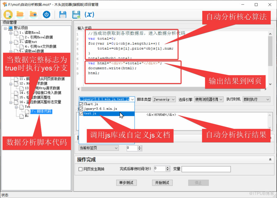 当获取到完整数据,具备数据分析条件时,执行Yes分支节点,Yes节点本身不做任何操作,在Yes节点下再添加数据分析步骤。使用JavaScript分析数据,在Yes节点下添加脚本代码步骤,并重命名为“自动分析核心代码”。