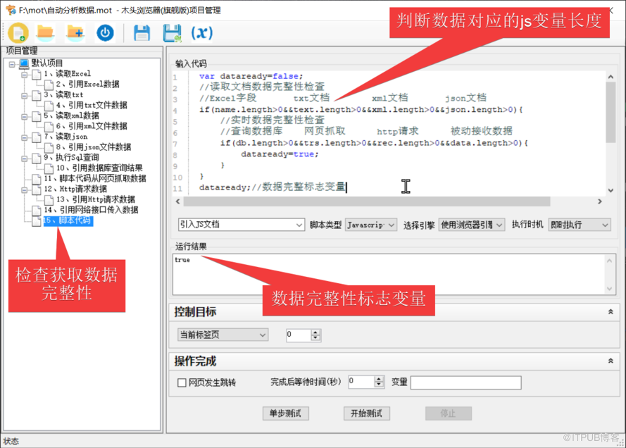 由于获取数据时已将所有数据保存在JavaScript变量中,所以仍然用JavaScript检验数据是否完整。在浏览器的项目管理窗口,新建脚本代码步骤,重命名为“检查数据完整性”。在代码中定义一个数据完整性的标志变量dataready,再判断来自名方面的数据是否存在,示例中仅判断数据的长度,最后返回标志变量的值。