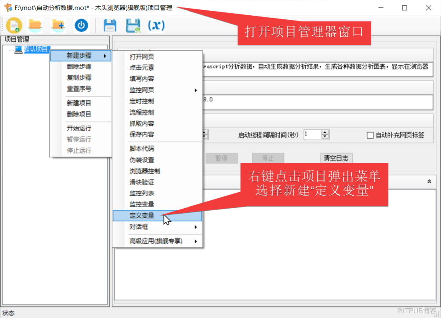 在项目管理器左侧默认项目上点击鼠标右键,弹出新建步骤快捷菜单,选择“定义变量“,打开自定义变量管理窗口。本节内容只要是读取文档的操作,都在这个定义变量的步骤中完成。