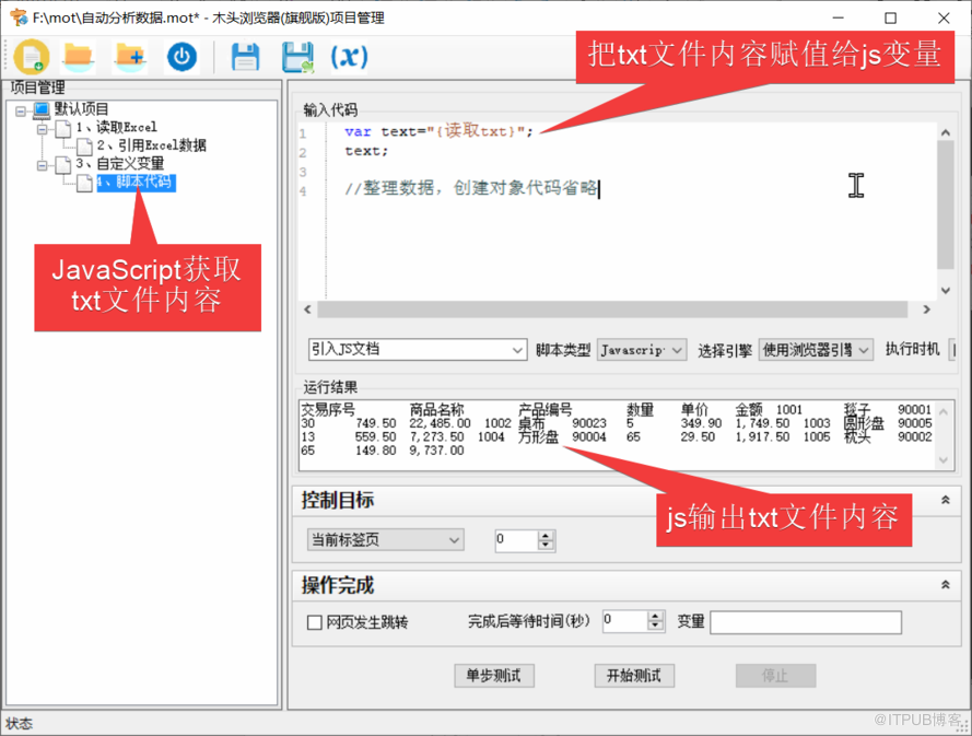 当浏览器执行该步骤前,先计算浏览器变量的值 ,再用其值替换对应的浏览器变量名。生成新的JavaScript代码再执行。获取整个文本文件内容后,可用JavaScript整理数据格式。