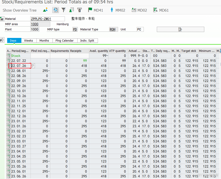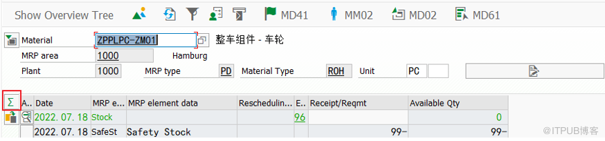 输入事务代码MD04,进入详细的界面,单击期间统计按钮,可以查看到目标库存的数据: