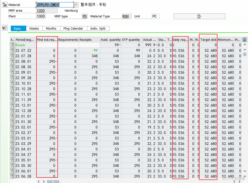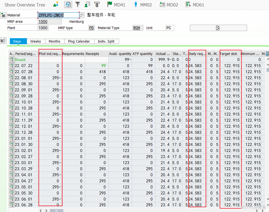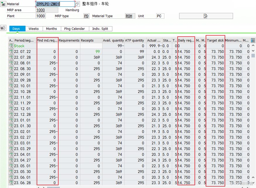 本次测试三种配置:W41、W42、W43分别对应3种日历期间长度类型,每个期间的长度为5天、7天、3天,期间长度都是4周,期间总天数为4*5=20,4*7=28,4*3=12,假设4周的总需求是295,则 目标库存:需求总和/(Number of periods* perriod length)*目标天数。