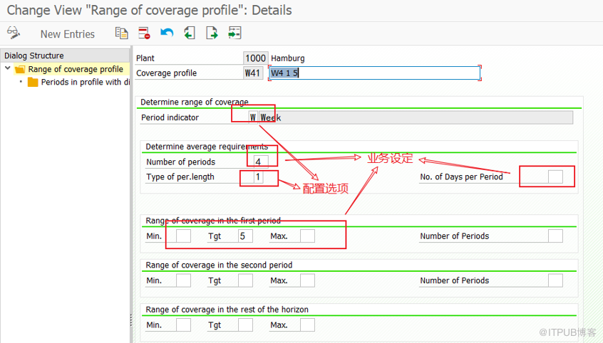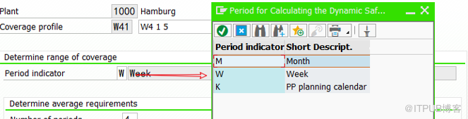 Period indicator:配置选项,有W(周)、M(月)、K(PP生产日历)。这个用来指定下面Number of periods是指周,还是月。图中选择W。