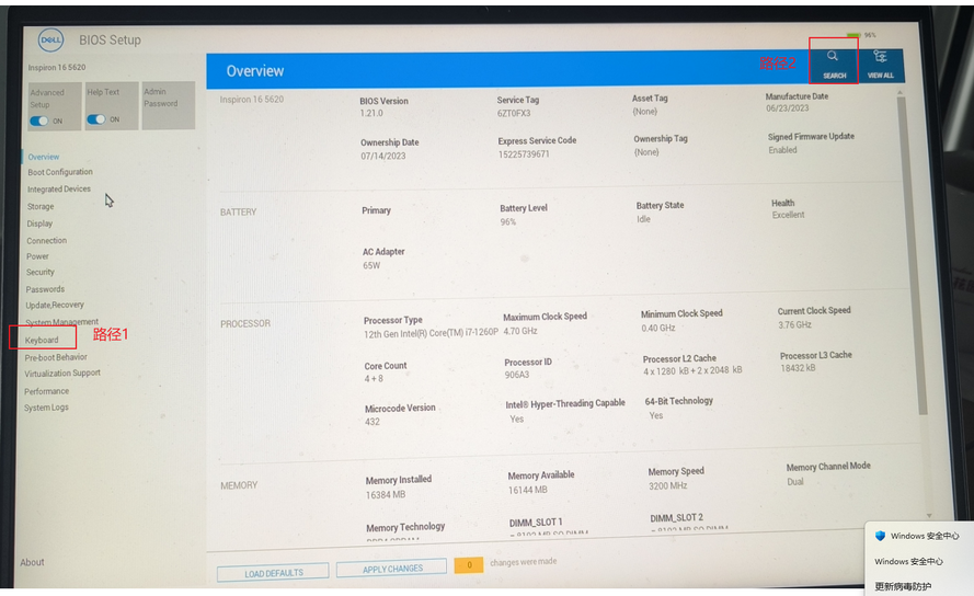 2.有两种方法可以找到设置,方法A,按路径1,找到左侧keyboard,左键点