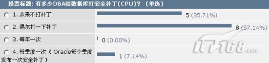 调查显示,从来不打补丁的用户高达35.71%,偶尔打一次补丁的用户为57.14%,这2项的数据加起来已经超过90%,根据Oracle补丁发布周期,每季度打一次补丁的用户占7.14%。
