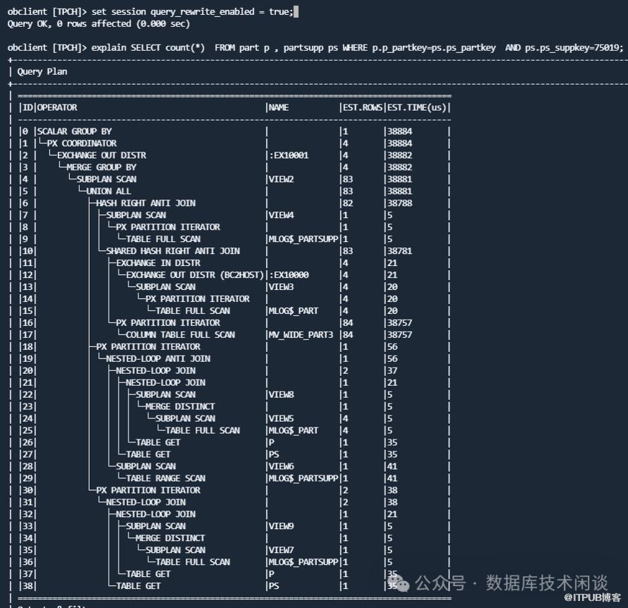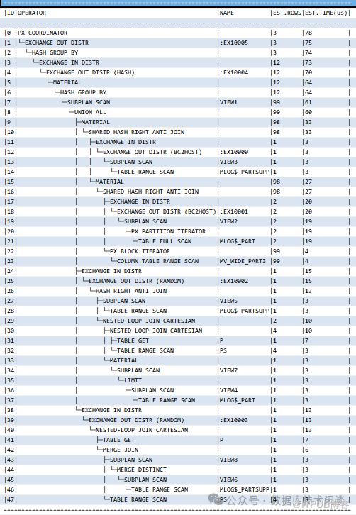 初步看这个执行计划非常复杂,实际上也比较有特点,就是基表的物化视图日志跟基表和原视图之间的各种连接过滤实现数据增量应用到物化视图上。 这就是实时物化视图的优点。