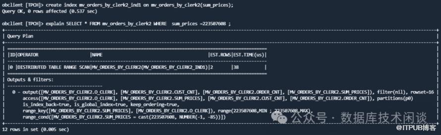 obclient [TPCH]> SELECT owner, table_name, index_name, uniqueness FROM dba_indexes WHERE table_name IN ('__mv_container_511117','mv_orders_by_clerk2');