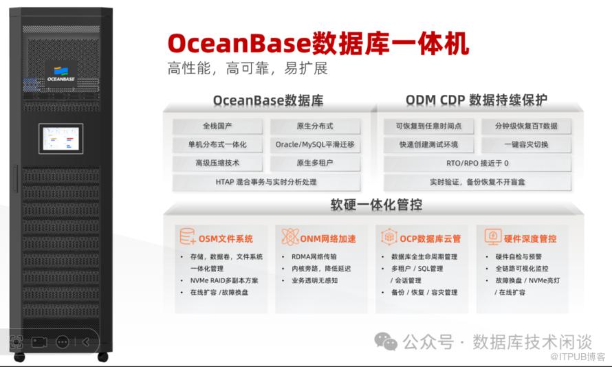 OceanBase 在 2019 年就试点过一体机。2019 年云栖大会我还给 OB 一体机站台过。(参考:2019 OB 一体机介绍)。OB 今年推出的一体机已经比当初要强大很多了,在硬件上使用国产服务器(海光)、国产IB交换机(H3C),在软件上使用了 OB 4.3.3、分布式文件系统 OSM、基于 RDMA 技术的 ONM 网络加速软件。实现了 NUMA Aware 技术动态多实例绑定,最大化提升 OB 在一体机上的性能。此外还有 ODM CDP 数据保护技术,相比 OB 租户备份还原而言,这个 CDP 恢复技术效率更高(特别适合金融证券场景)。一体机还有管控产品,在机柜上显示屏里也可以看到集群运行概况,对现场巡检也非常有好。