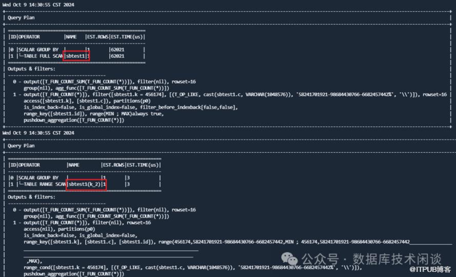 sbtest1 。然后同样的运行上面的观察语句。for i in `seq 36000`;do echo `date`; obclient -h127.1 -uu_test@obmysql -P2881 -p'123456' -c -A sysbenchdb -e "explain select count(*) from sbtest1 where k=456174 and c like '58241701921-98684430766-6682457442%';"; sleep 0.5 ;done